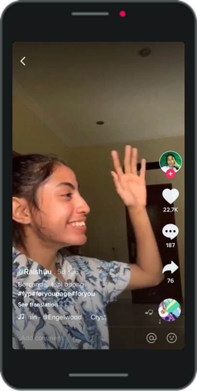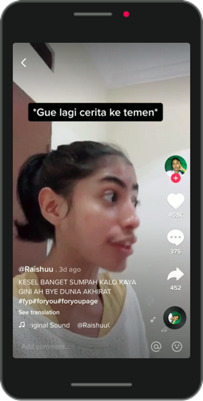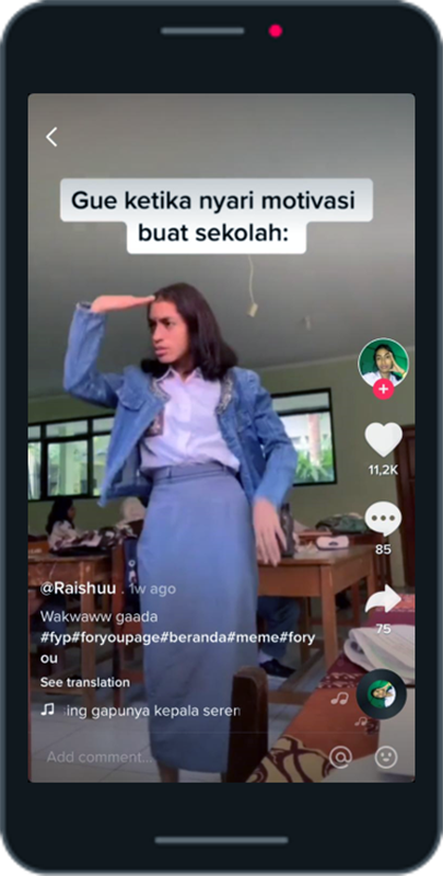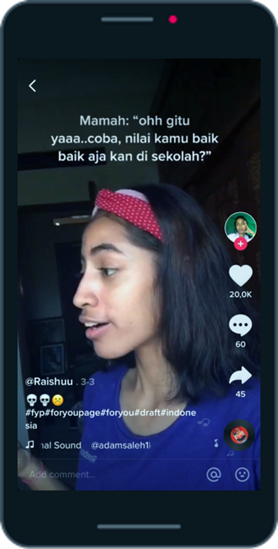 Kreativitas juga mendukung para pengguna untuk membuat konten komedi yang cocok dengan konteks sosial Indonesia, termasuk Raishuu, salah satu konten kreator komedi di TikTok. Sebagai perempuan yang mulai beranjak dewasa, Raishuu mengalami segudang masalah dalam proses pencarian jati dirinya.