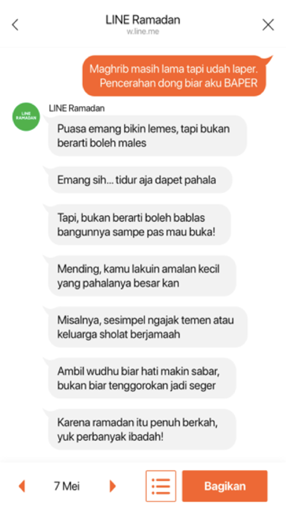 “Setelah tahun lalu kami meluncurkan chatbot Ramadan pertama di Indonesia, tahun ini kami fokus dalam memperkaya konten kami lewat fitur LINE Ramadan. Fitur ini kami rancang sedemikian rupa untuk memberikan pengalaman berpuasa yang seru namun juga penuh makna untuk para pengguna,” kata Dale Kim, Managing Director LINE Indonesia.