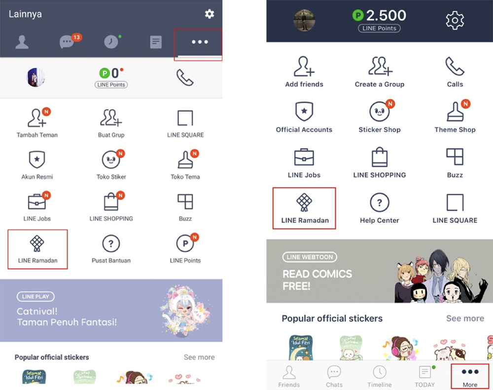 Pengguna LINE yang ingin mengikuti segala aktivitas yang disajikan di LINE Ramadan dapat menemukan fitur LINE Ramadan di bagian More Tab pada aplikasi pertukaran pesan LINE. Bagi pengguna iOS dan Android, More Tab berupa ikon tiga titik yang terletak di kanan bawah aplikasi.
