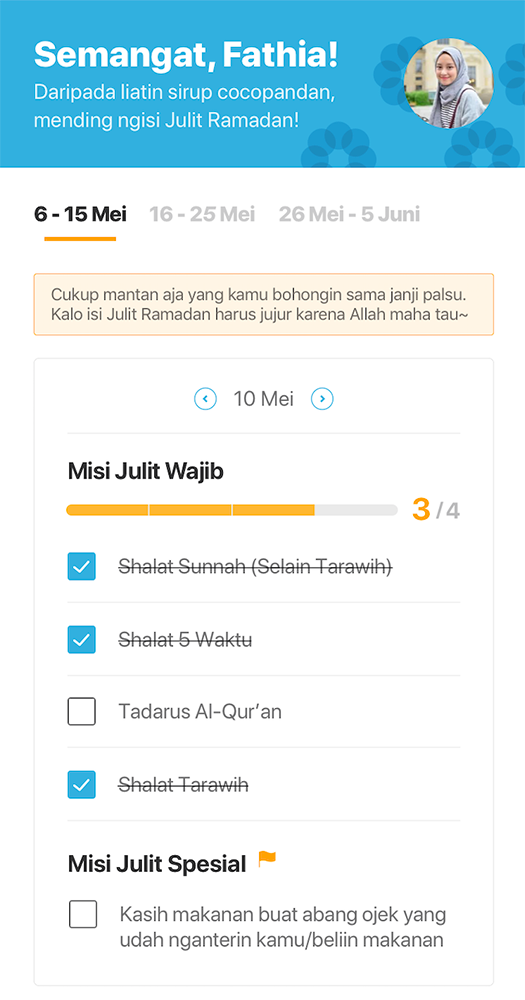 Bagi pengguna yang berhasil menyelesaikan misinya akan memiliki kesempatan untuk mendapatkan hadiah menarik. Sebelum memulai Julit Ramadan, pengguna akan disuguhkan sejumlah pertanyaan yang akan menentukan misi mereka selama satu bulan ke depan.