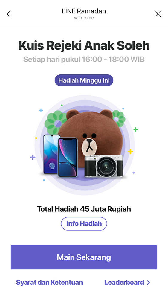 Melalui konten Rejeki Anak Soleh, LINE Ramadan akan memberikan kuis berupa sejumlah pertanyaan dengan pilihan ganda secara berkala kepada pengguna. Jika menjawab dengan benar, pengguna akan mendapatkan poin yang bisa dikumpulkan untuk mendapatkan hadiah menarik setiap minggunya.