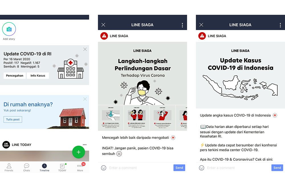 Timeline Akun Resmi LINE Siaga memberikan update terkait COVID-19, seperti Hotline atau panggilan darurat COVID-19, daftar rumah sakit di Indonesia yang menyediakan tempat perawatan pasien COVID-19, langkah-langkah pencegahan, dan data statistik yang memberikan update penderita COVID-19 di Indonesia secara real time. Informasi mengenai COVID-19 juga dirangkum dalam Rich Menu yang bisa dibuka pengguna pada ruang percakapan LINE Siaga. Ke depannya, LINE akan terus menambah ragam konten informatif dan edukatif terkait COVID-19 yang bersumber dari Kementerian Kesehatan RI (Kemenkes RI).