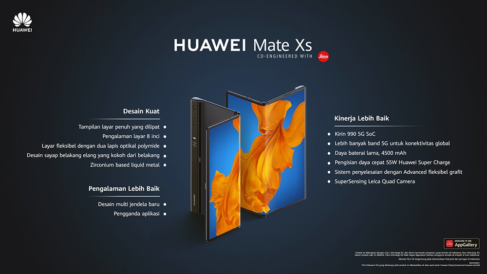 HUAWEI Mate Xs hadir dengan desain Falcon Wing, layar utama 8 inci, fitur multi-window untuk produktivitas pengguna, prosesor Kirin 990 5G, sistem pendingin Flying Fish Fin, Supersensing Leica Quad Camera dengan kamera utama 40MP (wide-angle, f/1.8), 16MP ultra-wide angle camera (f/2.2), 8MP telephoto camera (f/2.4, OIS) dan 3D depth sensing camera, dan tentu saja HUAWEI AppGallery.