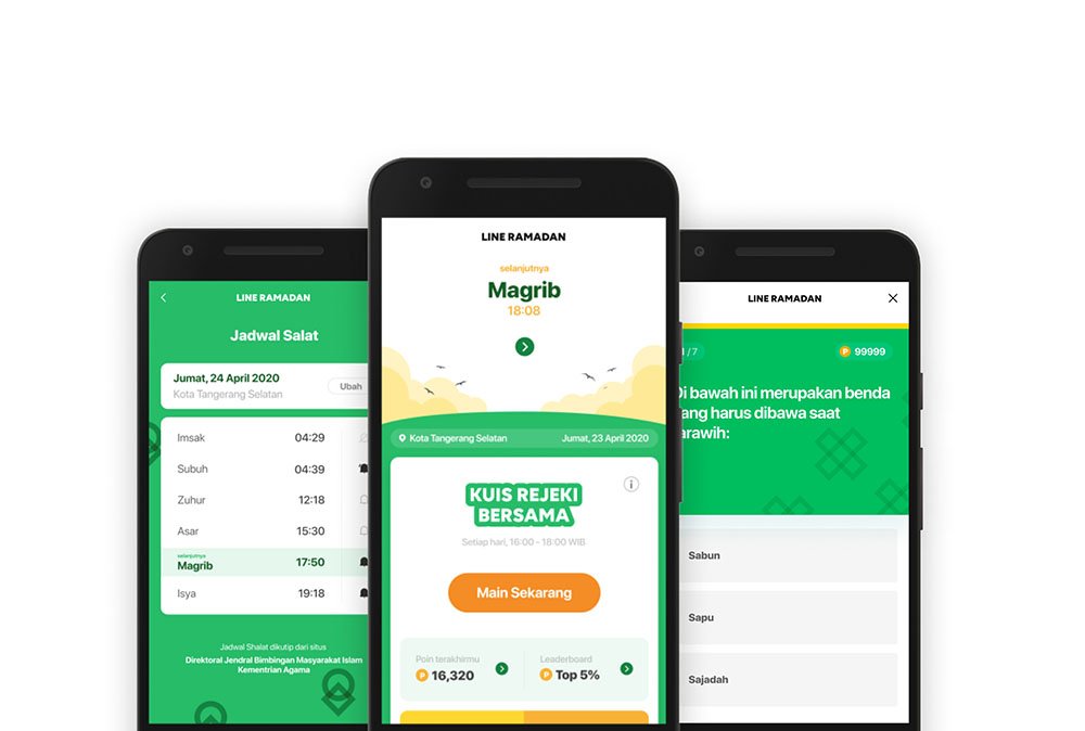Selain Kuis Rejeki BERSAMA, Akun Resmi LINE Ramadan juga menghadirkan konten harian yang bisa membantu kelancaran beribadah puasa, seperti Jadwal Sholat, Alarm Sholat, dan Kultum melalui Akun Resmi LINE Ramadan. Jadwal dan Alarm Sholat akan dikirimkan secara otomatis melalui notifikasi di Akun Resmi LINE Ramadan kepada pengguna.