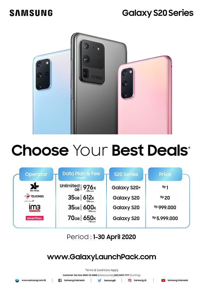 Paket data plan untuk Galaxy S20 dan S20+ bagi pelanggan baru dengan operator mitra Samsung (XL Axiata, Telkomsel, IM3 ooredoo, Smartfren) mulai dari Rp 1 (satu rupiah). Belaku mulai 1 hingga 30 April 2020.