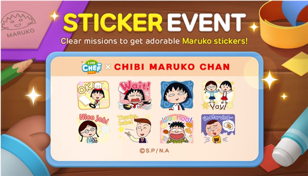 Sebagai bagian dari kolaborasi spesial ini, ada 8 buat stickers Chibi Maruko-chan yang dapat diunduh oleh pemain. Stickers ini tersedia dalam jumlah yang terbatas mulai 11 Februari pukul 11:00 AM hingga 10 Maret 2020 mendatang pukul 11:59 PM. Untuk informasi lebih lanjut bisa melihat pengumuman yang terdapat di dalam game.