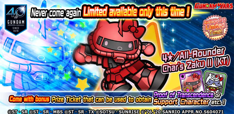 4★/Char’s Zaku II (KT) akan tersedia dalam waktu yang terbatas sebagai gacha. Char’s Zaku II (KT) merupakan mobile suit yang kuat yang juga bisa menembakkan hati dari sebuah bazoka dan menyerang musuh dengan heat hawk berbentuk hati. Lebih jauh lagi, pemain juga bisa menggunakan kupon bonus yang hadir dengan 11 Consecutive Mobilization guna mendapatkan Hello Kitty ★ Char – sebuah karakter pendukung baru yang dapat meningkatkan kemampuan sebuah mobile suit.