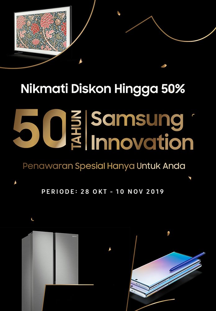 Periode 28 Oktober hingga 10 November 2019, konsumen Indonesia dapat menikmati penawaran khusus dengan Promo Inovasi Samsung ke-50, sebagai berikut: