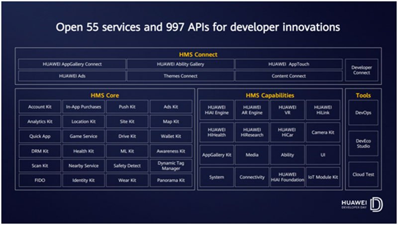 Huawei Mobile Services juga telah mebuka kemampuan chipset-perangkat-cloud kepada developer global, yang memberikan akses penuh kepada developer untuk masuk ke dalam 24 HMS Core Kits, 55 layanan, dan 997 APIs. Kemampuan terbuka HMS meliputi beragam skenario pengembangan dengan layanan seperti Map, In-App Purchases (IAP), HiAi, AR dan VR.