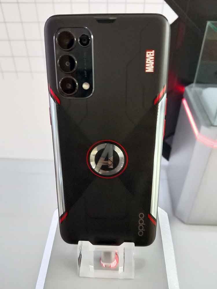 OPPO mengemas Reno5 Marvel Edition secara spesial. Pada bagian penampang belakang, OPPO mendesain perangkat ini dengan mengabungkan berbagai karakter dan elemen dari seri Marvel Avengers ke setiap aspek perangkat untuk menciptakan sebuah item koleksi bagi fans Marvel. Perpaduan warna hitam, abu–abu, perak dan merah memberikan kesan perangkat yang memiliki teknologi tinggi yang terinspirasi dari teknologi superhero Marvel.