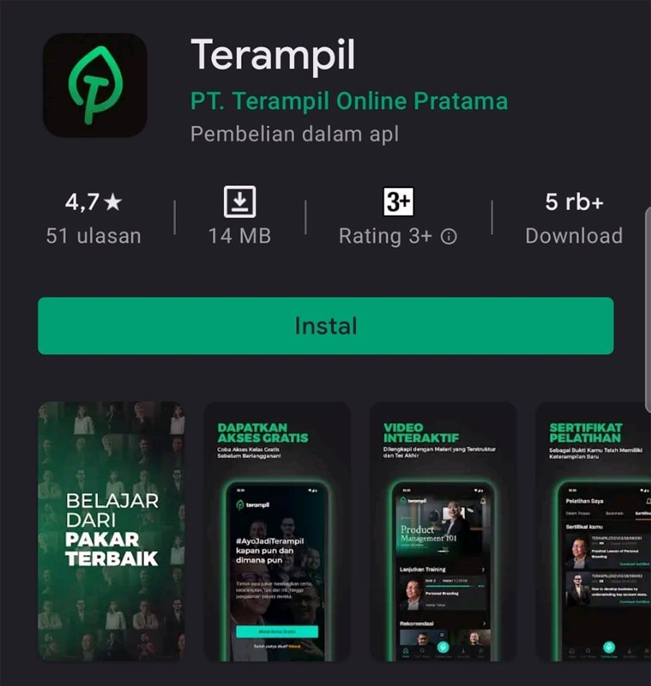 Terampil di Play Store untuk pengguna Android dan App Store untuk pengguna iOS. Pengguna baru Terampil akan mendapatkan free trial sebanyak 5 (lima) video pelatihan. Di akhir materi training, Terampil mengadakan post-test untuk menguji pemahaman materi yang dipelajari oleh Terampil People. Apabila nilai tes tersebut sesuai kualifikasi maka Terampil People akan mendapatkan Sertifikat Resmi dari Terampil, sebagai Lembaga Pendidikan dan Pelatihan yang memiliki izin resmi dari pemerintah.